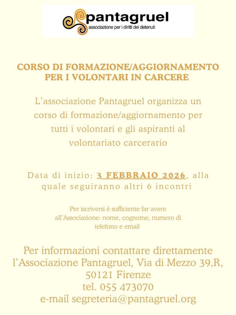 Corso di formazione per volontari in carcere – dal 3 febbraio al 17 marzo Gennaio 16, 2026Gennaio 16, 2026 admin orario 18.30 – 20.30 presso il Centro Comunitario Valdese in via Manzoni 19/A, Firenze Condividi:FacebookStampaE-mail admin